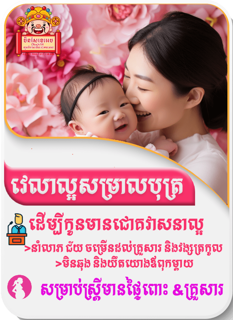 - ហេតុអ្វីមានសារសំខាន់ក្នុងការជ្រើសរើសពេលវេលាសម្រាលកូនតាមចិនសែ?នៅក្នុងហោរាសាស្រ្តចិន ការជ្រើសរើសពេលវេលាដ៏ល្អសម្រាប់ការសបន្តការអាន “ហេតុអ្វីមានសារសំខាន់ក្នុងការជ្រើសរើសពេលវេលាសម្រាលកូនតាមចិនសែ?”